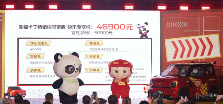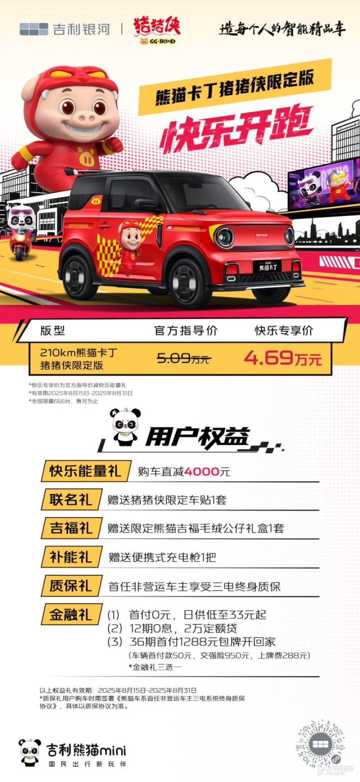 8月15日,吉利熊猫卡丁猪猪侠限定版正式上市,新车官方指导价5.09万元,在8月31日前购车的用户可享“快乐能量礼”,购车直减4000元,快乐专享价4.69万元。2025年8月15日—2025年8月31日购车的用户,更有“联名礼、吉福礼”等五重购车权益可享。根据官方透露,新车限量666台,并且每台车均附带专属编号铭牌。